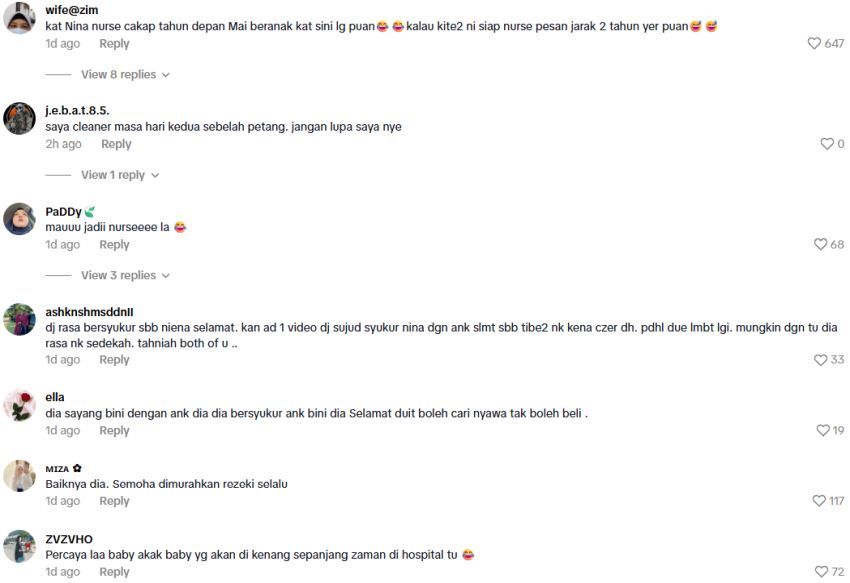 LAZIMNYA selepas seorang wanita melahirkan anak, si suami akan menghadiahkan sesuatu sebagai tanda penghargaan atas pengorbanan isterinya.Ada yang memberi bunga, barang kemas dan tak kurang juga membuat kejutan istimewa. Namun, satu video yang tular di media sosial menarik perhatian ramai apabila seorang lelaki memberi penghargaan kepada jururawat yang menjaga isterinya sepanjang proses kelahiran.Video memaparkan suami Niena membawa beg hadiah berupa loket di wad bersalin. Menerusi video yang dimuat naik oleh seorang usahawan dan pempengaruh media sosial, Shaniena Natasya, kelihatan suaminya, Choudhry Wasim atau lebih dikenali sebagai DJ Twister membawa beberapa beg hadiah untuk diberikan kepada petugas kesihatan di wad bersalin. Lebih menarik perhatian, hadiah berkenaan berupa loket emas dengan rekaan yang setiap satunya berbeza.ARTIKEL BERKAITAN: Kecoh payment tak cukup! Pengantin disekat masuk bilik, hotel tahan makanan tetamu... rupanya wedding planner songlap duitARTIKEL BERKAITAN: Orang lain tayang hadiah beranak, wanita teringin tapi suami tak layan... Bagi merasa CL 3 hari je, itu pun lepas didesak"Macam you buka kedai emas di dalam hospital. Semua orang awak beri hadiah. Macam-macamlah," kata Shaniena dalam video berdurasi 1.21 minit yang dimuat naik di aplikasi TikTok.Kesemua beg hadiah berkenaan disusun sebelum diberikan kepada para jururawat yang bertugas. Untunglah nurse... mesti mereka layan baik dengan dia.NETIZENVideo berkenaan meraih sehingga 1.9 juta jumlah tontonan selain dibanjiri ratusan komen netizen yang memuji Shaniena dan suaminya kerana tidak lokek memberi hadiah yang mahal untuk menghargai jasa para jururawat."Dia sayang isteri dan anak. Dia bersyukur isterinya selamat. Duit boleh dicari, nyawa tak boleh dibeli.Antara komen warga maya terhadap perkongsian Niena. "Untunglah nurse... mesti mereka layan baik dia. Semoga murah rezeki selalu."Akhlak yang patut dicontohi. Menghargai pasukan perubatan yang membantunya ketika melahirkan cahaya mata," demikian antara komen netizen. Sebelum ini, Shaniena membuat perkongsian memaparkan dia dan suaminya membeli sebuah kenderaan jenis MPV mewah bagi menyambut kelahiran cahaya mata sulung mereka selepas dua tahun menunggu.
