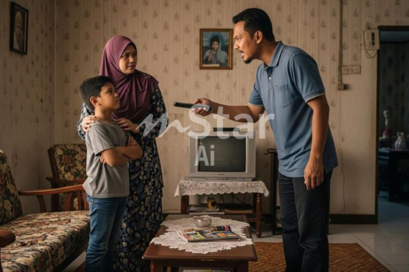 "Anak merengek nak tengok rancangan K-Pop. Si ayah pula mahu menonton rancangan lain. Anak menangis tidak ditenangkan, dan si ibu cuba campur tangan.