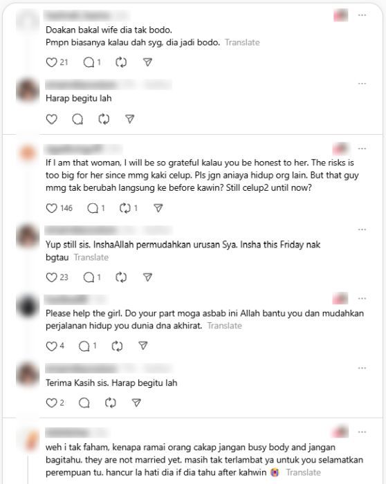 BIARPUN sudah membawa haluan masing-masing dan memulakan kehidupan baharu, namun tidak dinafikan pasti timbul pelbagai perasaan apabila mengetahui bekas kekasih bakal melangsungkan perkahwinan.Begitu juga individu ini, namun perasaan yang hadir bukan cemburu tetapi lebih kepada rasa bersalah dan bimbang. Menurut individu berkenaan, dia mengetahui rahsia besar bekas pasangannya itu dan khuatir lelaki berkenaan akan merosakkan masa depan calon isterinya jika meneruskan perkahwinan. Setiap individu ingin bertemu jodoh dengan pasangan yang baik. -Gambar hiasan"Ex-partner aku dah nak kahwin, bakal suri hati dia aku kenal. Aku tahu ex-partner tu biseksual. Segala isteri, suami, pakcik dia rembat. Aku risau bakal bini dia je."Perlu ke aku bagitahu bakal isteri dia, aktiviti dekat luar dia? Tolong aku, aku kesian dekat bakal bini dia je. Dia pergilah mamp*s," tulisnya dalam satu hantaran di media sosial.ARTIKEL BERKAITAN: Suami mengaku biseksual, suka lepak dengan kawan sejenis... Isteri sabar sebab nafkah zahir batin ‘A’ARTIKEL BERKAITAN: Lelaki gay tak kisah nikah wanita tangkap muat! Cerai tak sampai setahun, bekas isteri masih dara tak pernah disentuhIndividu itu menambah, tabiat bekas pasangannya itu yang 'ligat' dalam aktiviti seks menjadi antara sebab dia nekad untuk memutuskan hubungan mereka."Aku setia, jadi break sebab aku tak boleh ubah tabiat dia. Ingatkan masa break dia nak berubah, tapi masih macam dulu," luahnya.Individu tersebut menambah, niatnya untuk membuat pendedahan kepada wanita yang bakal menjadi isteri bekas pasangannya itu hanyalah bertujuan untuk menyelamat masa depannya, dan langsung tidak didasari niat jahat.Seorang lelaki dilema sama ada perlu dedahkan rahsia bekas pasangannya yang biseksual kepada bakal isteri lelaki itu.Dia risau kerana bekas kekasihnya sangat aktif terlibat hubungan seks bebas.Hubungan mereka dahulu putus kerana dia tidak tahan dengan tabiat seksual bekas pasangannya itu.Dia menafikan dirinya cemburu, sebaliknya hanya mahu selamatkan masa depan bakal isteri bekas pasangannya itu.Netizen menyokong agar perkara sebenar diberitahu demi lindungi wanita berkenaan daripada risiko hubungan toksik dan penyakit.Ringkasan ini dijana oleh AI"Saya tak cemburu. Untuk apa, kalau kehidupan dia pun terkontang kanting. Diorang tak kahwin lagi. Baru bertunang dan rancang kahwin sepatutnya April 2026. "Tapi lelaki tu nak percepatkan. Sebab tu saya rasa macam something fishy," tulisnya lagi.Dalam hantaran berasingan, individu tersebut berkata dia sudah pun mengatur pertemuan dengan wanita berkenaan dalam waktu terdekat.Di ruangan komen, warga maya tampil dengan reaksi yang bercampur dengan ada yang berpendapat dia tidak berhak mencampuri urusan orang lain.Sebahagian daripada reaksi netizen.Namun rata-ratanya menyokong tindakan wanita tersebut kerana berpandangan bakal isteri bekas pasangannya perlu diberitahu perkara sebenar."Kena bagitahu. Sebab takut dia akan merosakkan anak dara orang. Dia bakal menjangkitkan penyakit kelamin pada orang lain,"Bayangkan kalau kakak adik perempuan kita yang terkena. "Kalaulah saya perempuan tu, saya akan bersyukur kalau awak jujur padanya. Risiko sangat besar untuk dia sebab dapat lelaki kaki celup," demikian komen netizen.