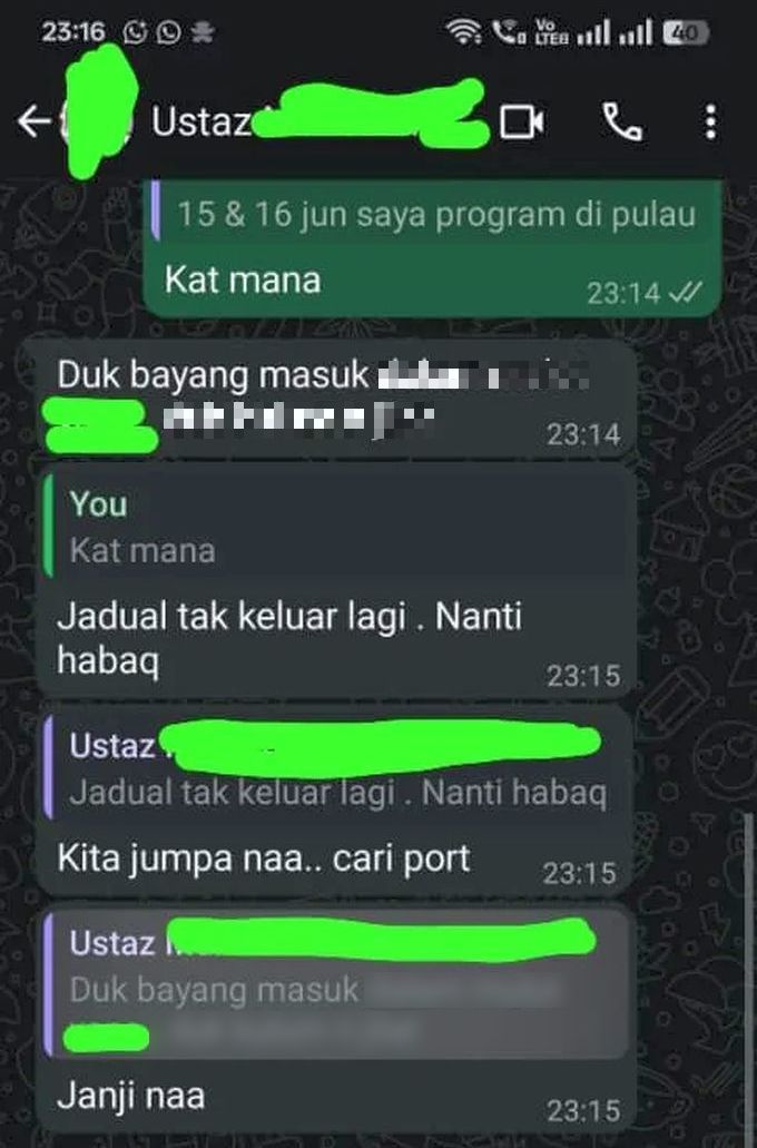 KISAH lelaki hidung belang yang bersembunyi di sebalik pakaian dan penampilan baik semakin menjadi-jadi sejak kebelakangan ini.Di media sosial, seorang wanita dikenali sebagai Hanishaneem mendedahkan sisi gelap individu yang berperwatakan warak tetapi menghantar mesej berunsur lucah sebagai peringatan kepada umum. Dakwanya, mereka yang memegang gelaran ustaz tidak terkecuali daripada melakukan maksiat sehingga digelar penunggang agama.Golongan ustaz dikatakan menggunakan alasan 'gangguan' bagi mendekati mangsa. -Gambar hiasan"Saya kongsikan kisah ini supaya lebih ramai berhati-hati dengan mana-mana lelaki, walaupun dia berstatus ustaz."Sebelum lebih ramai yang menjadi mangsa si penunggang agama ni, ustaz pun begini... apatah lagi yang lain," luahnya menerusi hantaran di Thread.Tangkap layar perbualan yang turut dikongsikannya.Menyedari perkongsiannya itu akan memberi kesan besar terhadap imej agama, namun bagi Hanishaneem, dia perlu mendedahkan modus operandi golongan berkenaan.Tambahan pula mereka menjadikan wanita berstatus isteri orang sebagai sasaran utama kerana tidak perlu bertanggungjawab.ARTIKEL BERKAITAN: Lelaki gila seks ligat meraba dalam bas, siap ramas-ramas! Wanita sempat rakam, mengadu pada pemanduARTIKEL BERKAITAN: Hancur hati, lelaki disangka jodoh ajak borak lucah! Tiba-tiba cerita tidur tak pakai seluar, balas sepatah makin galak"Tidak ada niat nak jatuhkan sesiapa apatah lagi mereka yang berstatus guru agama."Tapi demi umat, demi agama, demi maruah kami terpaksa dedahkan apatah lagi nama dia sekarang sedang meningkat naik dan banyak dijemput masjid-masjid serta maahad."Sasaran dia adalah isteri orang yang pada pandangan dia mungkin ada masalah rumah tangga, sebab dia tak perlu bertanggungjawab, tiada desakan nikah," tambahnya lagi.Seorang wanita dedah ustaz berperwatakan warak tapi hantar mesej lucah.Ustaz terbabit disifatkan penunggang agama, jadikan isteri orang sebagai sasaran.Modus operandi: tawar rawatan perubatan untuk dekati mangsa.Wanita itu nekad bongkar demi lindungi maruah dan beri amaran pada umum.Netizen gesa dia dedahkan identiti ustaz dan lapor pihak berkuasa.Ringkasan ini dijana oleh AIMenurut Hanishaneem, kebanyakan ustaz berhidung belang akan merapati 'wanita idaman' dengan menawarkan perkhidmatan rawatan."Modus operandi ustaz berhidung belang seperti ini adalah... awak sakit, kena berubat," katanya.Perkongsiannya itu mengundang pelbagai reaksi warga maya berikutan tangkap layar mesej yang dikongsikannya berbau lucah.Antara reaksi warga maya.Tidak kurang juga yang memintanya untuk mendedahkan siapa individu terbabit supaya tindakan tegas dapat diambil."Jawapan biasa mereka ialah, semakin alim semakin banyak ujian, dasar penunggang."Memang ada sesetengah orang alim ni gila seks, personaliti nampak alim tapi sebaliknya."Kalau nak share, bagi details, janganlah jadi bodoh konon nak sorok-sorok nama ustaz tu. Lapor polis dan buat apa yang patut," demikian reaksi warga maya.