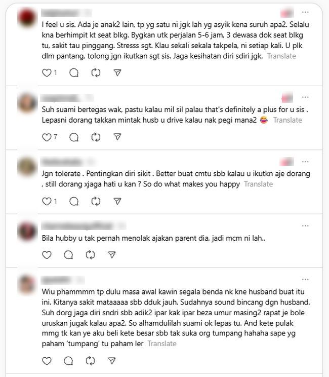 ANAK lelaki sering dianggap sebagai tonggak dan harapan keluarga. Namun dalam sesetengah situasi, peranan tersebut diambil kesempatan oleh keluarga sendiri sehingga membebankan si anak, sebagaimana kisah yang dikongsikan seorang wanita di laman sosial. Menerusi perkongsian tersebut, wanita itu berkata suaminya sering dijadikan sasaran untuk menjadi 'pemandu keluarga' terutamanya apabila perlu melakukan perjalanan jauh.Campur tangan mentua boleh menjadi punca pasangan berselisih faham. -Gambar hiasan"Apa rasanya apabila suami korang jadi orang penting dalam family dia? Adik-beradik lain ada je tapi duduk jauh. Jadi yang dekat inilah kena jadi hamba," luahnya.Menurut wanita yang tidak mendedahkan identiti diri itu, situasi tersebut bukan perkara baharu kerana ia berlaku sejak awal perkahwinan mereka lagi.ARTIKEL BERKAITAN: Anak baru kahwin serba salah dengan suami... Ibu suka berkemban, tak pakai coli di rumah! Susah nak tegur sebab dah selesa, terbiasaARTIKEL BERKAITAN: Anak mahu tutup bisnes, nak ikut suami pindah! Serba salah fikir bapa hilang gaji RM4,000, susah cari kerja lain sebab dah tuaPengadu turut berkongsi peristiwa yang membuatkan dia benar-benar terkilan, iaitu ketika masih dalam tempoh berpantang namun tetap diajak menyertai rombongan ke majlis perkahwinan ahli keluarga mentuanya di utara tanah air.Walaupun masih belum pulih sepenuhnya, mereka terpaksa berhimpit di dalam sebuah kereta untuk perjalanan yang mengambil masa sekitar lima hingga enam jam. Seorang wanita meluah rasa kecewa kerana suaminya selalu dipergunakan oleh keluarga sendiri.Suaminya jadi ‘sasaran’ setiap kali keluarga mahu berjalan jauh.Situasi itu berlaku sejak awal perkahwinan mereka lagi.Dia dan suami terpaksa mengikut kehendak mentua biarpun ketika masih dalam pantang, sehingga berhimpit dalam kereta berjam-jam.Lebih terkilan, mentuanya pernah menarik muka apabila dia dan suaminya pernah menolak hasrat mereka. Ringkasan ini dijana oleh AI"Memang kena berhimpit lima orang dalam kereta iaitu suami, bapa mentua, ibu mentua, adik ipar dan aku dekat belakang."Aku dah cakap tak nak pergi sebab masih dalam pantang. Suami pula kalau aku tak pergi, memang dia tak pergi. Jadi kalau suami tak pergi, maka satu rumahlah tak boleh pergi sebab memang harapkan suami aku je yang memandu."Apabila suami aku beritahu tak boleh pergi, mentua terus palau aku. Siap tarik muka, bertegur pun tak nak. Terpaksalah aku pergi. Tapi itulah, pengorbanan aku tak dihargai juga."Ni dengar-dengar mentua nak ajak berjalan rumah abang ipar pula... kali ni memang aku tak nak pergi," ujarnya. Sebahagian daripada komen warga maya.Di ruangan komen, pelbagai reaksi dilontarkan warga maya dengan ramai yang berkongsi pandangan berdasarkan pengalaman masing-masing."Apabila suami awak tak pernah menolak ajakan parents dia, jadi macam inilah."Suruh suami bertegas, kalau mentua palau, baguslah. Lepas ni mereka takkan minta suami awak jadi pemandu lagi. "Pentingkan diri sikit. Better buat macam tu sebab kalau awak ikutkan saja, mereka tetap tak jaga hati awak," demikian antara komen netizen.