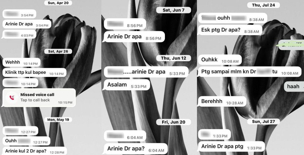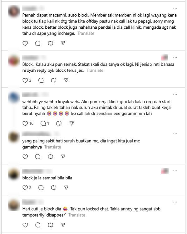 HARI cuti sememangnya masa yang ditunggu-tunggu untuk merehatkan tubuh badan dan fikiran selepas penat bekerja.Namun ia pasti terganggu jika pada hari berkenaan anda menerima mesej serta panggilan daripada kenalan yang bertanyakan hal remeh. Itulah situasi yang sering dihadapi seorang individu, dipercayai petugas di sebuah klinik, yang meluahkan rasa rimas apabila 'diganggu' kenalan semata-mata kerana mahu meminta sijil cuti sakit (MC). Sebahagian tangkap layar (screenshot) mesej yang dikirim kenalan individu tersebut."Cuti aku, waktu aku tidur diganggu dengan soalan macam ni. Sikit-sikit sudahlah, jika melebih siapa nak layan? Annoying tahu tak. Apa kata kamu hubungi sendiri tempat tu?" tulisnya dalam satu hantaran di laman sosial.Menurut individu tersebut, tempat dia bekerja merupakan klinik panel kepada syarikat kenalannya itu, sekali gus dia sering menjadi 'mangsa' untuk memberi informasi mengenai doktor bertugas bagi memudahkannya mendapat cuti sakit.ARTIKEL BERKAITAN: Buat video show off selepas rakan ikut bercuti, tapi tak ada ‘common sense’ hulur duit minyak - “10 jam perjalanan, siap hantar seorang demi seorang balik rumah”ARTIKEL BERKAITAN: Wanita serik bercuti dengan rakan... Selamba bogel dalam bilik jalan ke hulu, ke hilir! 'Rosak' pemandangan indah"Dia panel, tak perlu bayar pun dan senang dapat MC. Saya faham je kalau dia nak dapat layanan atau rawatan terbaik daripada doktor."Tapi kalau setiap berapa jam, berapa minggu nak tanya macam ni, bengang jugalah. "Saya ada je cakap dekat dia, call je klinik. Sebab saya bukan setiap masa dekat klinik apabila dia tanya. Dah suruh call klinik, tak mahu. Nak tanya kita juga," tulisnya lagi.Seorang petugas klinik meluahkan rasa rimas diganggu kenalan ketika hari cuti.Kenalannya sering bertanya mengenai doktor bertugas untuk memudahkannya mendapat MC.Individu tersebut sudah menasihatkan kenalannya supaya terus hubungi klinik, tapi tidak diendahkan.Gangguan berlaku berulang kali walaupun mesej dan panggilan sengaja diabaikan.Netizen beri sokongan dan mencadangkan supaya individu itu menyekat saja kenalan yang menyusahkan.Ringkasan ini dijana oleh AIBiarpun sudah beberapa kali dia sengaja mengabaikan mesej serta panggilan kerana enggan melayani perkara remeh seperti itu pada waktu cuti, namun kenalannya seolah-olah tidak memahami 'isyarat' yang cuba disampaikan.Menerusi hantaran tersebut juga, dia memuat naik beberapa imej tangkap layar (screenshot) 'siri gangguan' yang diterima daripada kenalannya itu. Di ruangan komen, warga maya tampil dengan pelbagai reaksi dan saranan kepada individu berkenaan bagi mengatasi situasi yang dihadapinya. Antara komen dan reaksi warga maya terhadap perkongsian tersebut."Pernah kena macam ni, auto block. Tak kira member atau pun tidak. Yang kena block tu tiap kali nak datang, time kita offday."Aku pun kerja klinik, beginilah kalau orang dah start tahu. Paling tak boleh tahan nak suruh aku minta doktor buat surat mengatakan dia tak boleh buat kerja berat."Kalau aku pun semak. Setakat sekali dua tanya okay lagi. Ini jenis tak reti bahasa, tak payah reply banyak, block terus je," demikian antara komen netizen.