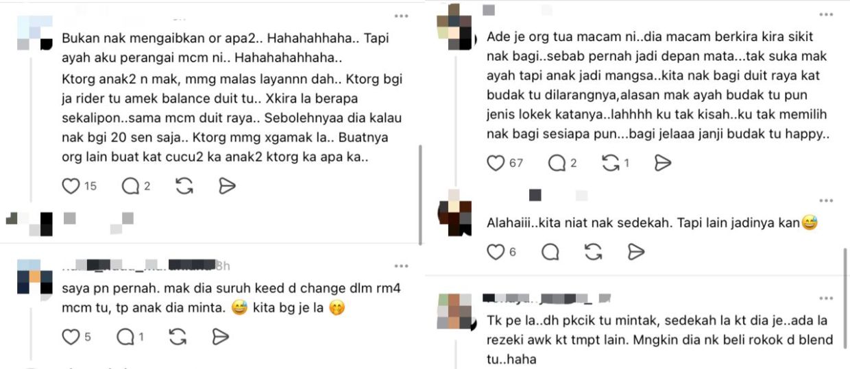 "Tak mengapa la sebab pakcik tu minta. Sedekah la dekat dia je. Ada la rezeki awak dekat tempat lain. Mungkin dia nak beli rokok tu," komen beberapa netizen.