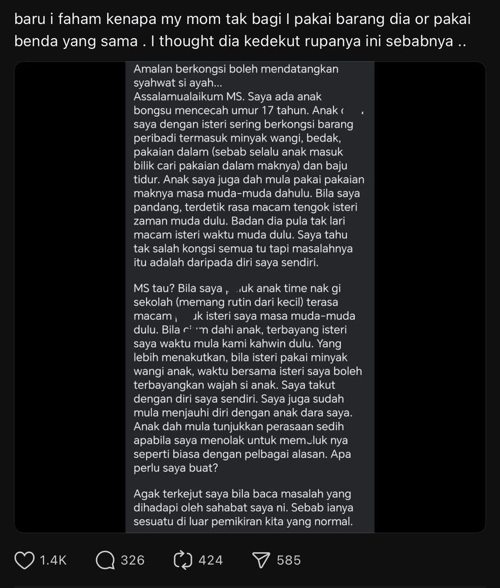 "Ramai je mak dan anak kongsi barang, elok je bapanya. Tak ada pula naik syahwat kat anak... lagi bangga sebab anak dah besar ikut sifat dan kecantikan mama.