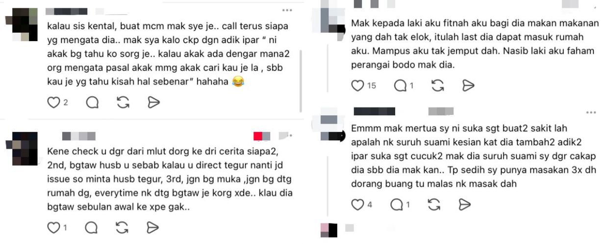 "Tambahan lagi adik-adik ipar suka sangat cucuk (menghasut) suruh suami saya dengar cakap mentua," ujar wanita ini.