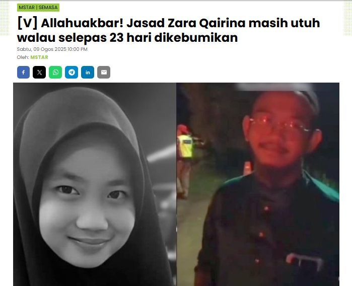 - Kisah jenazah Zara Qairina masih utuh tular di media sosial.