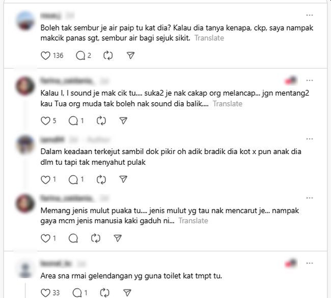 Seorang wanita kongsi pengalaman tak menyenangkan ketika guna tandas awam, di mana seorang warga emas guna bahasa kasar ketika menegur pengguna lain.