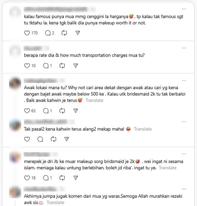 "Ini macam harga untuk bride dah. Kalau MUA famous memang macam ni lah rate diaorang untuk pengantin," komen netizen.