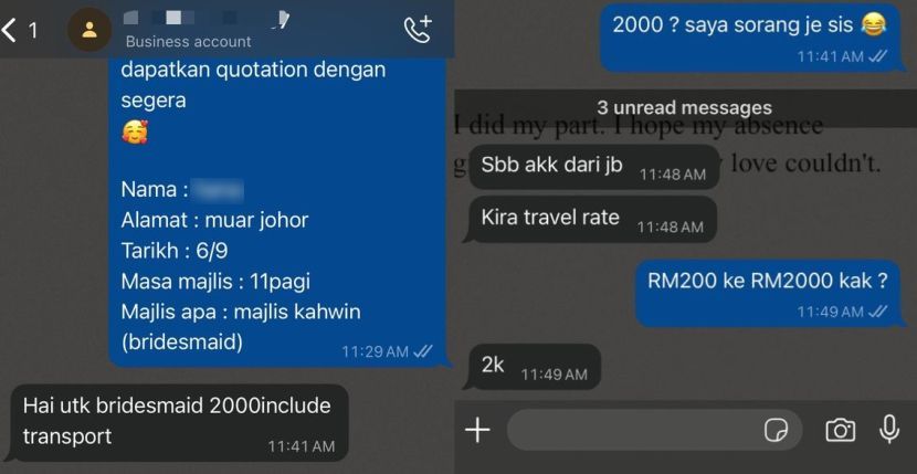 Berdasarkan tangkap layar perbualan yang dikongsikan itu, jurusolek itu memberikan sebut harga (quotation) servis solekannya berjumlah RM2,000 termasuk kos pengangkutan.