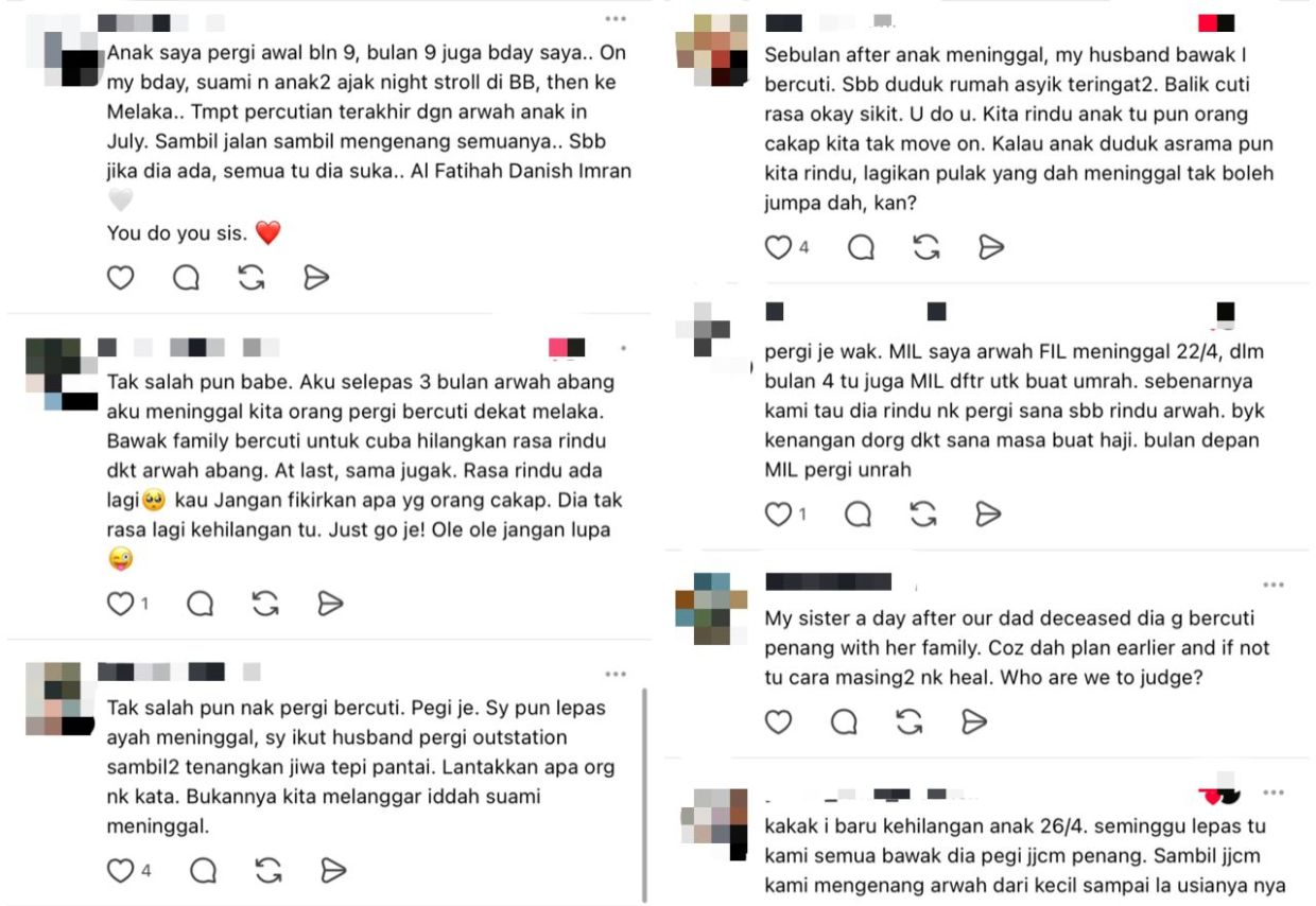 SEORANG wanita meluahkan rasa terkilan apabila keluarganya disindir kerana pergi bercuti selepas 70 hari kehilangan insan tersayang.