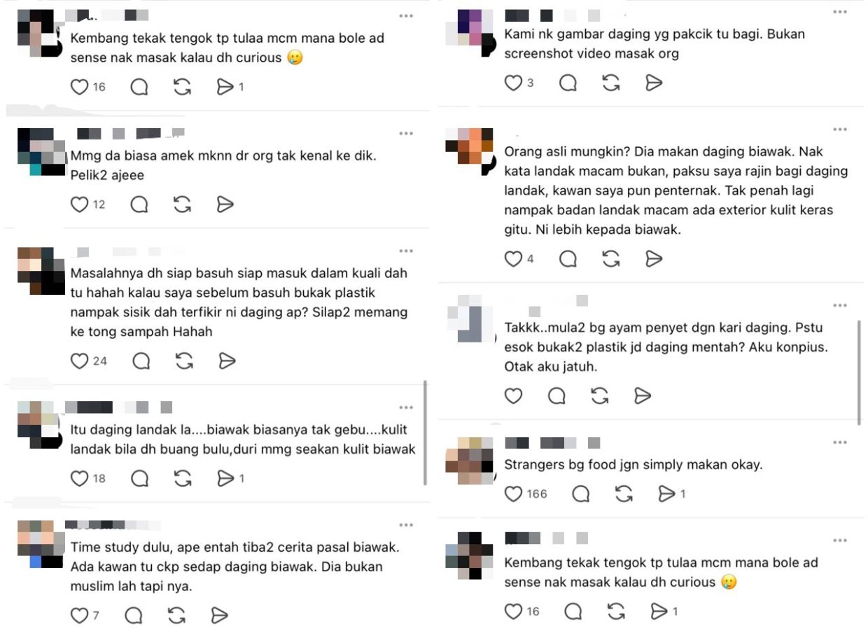 "Tapi daging tu tak banyak. Namun masih ada rasa sangsi kenapa daging tu bersisik. Saya dah cuba tengok (rupa bentuk) daging landak. Daging landak kulitnya cerah, tak hitam macam saya dapat tu.