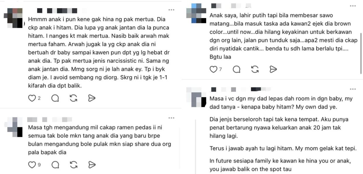 "Mak mentua cakap makan benda macam tu nanti anak keluar hitam (berkulit gelap). Dia ingat kelakar la tu," kata wanita itu dalam hantarannya.