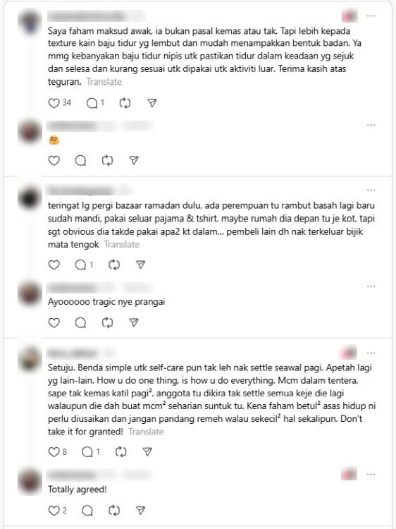 Kebanyakan netizen setuju memakai baju tidur di luar rumah kelihatan tidak sopan dan kurang beradab.