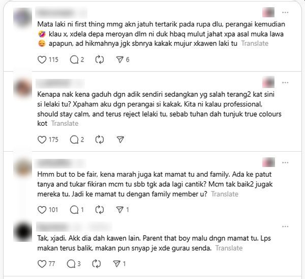 "Semua pandang dekat dia dan ayah dia beritahu, masih belajar. Nak singkatkan cerita, mamat tu berkenan dengan member aku, tak jadi ambil kakak dia sebagai isteri," tulisnya dalam hantaran berkenaan, mengimbas kembali kisah membabitkan rakannya yang berlaku 10 tahun lalu.