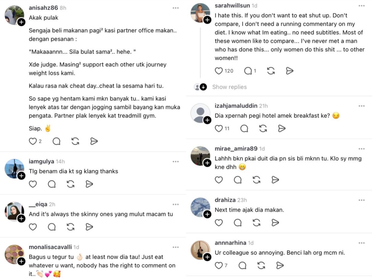 Menurut perkongsian wanita berkenaan, rakannya itu sering mengeluarkan kata-kata sindiran setiap kali dia sedang menjamu selera di pejabat, seolah-olah dia makan tak henti-henti.