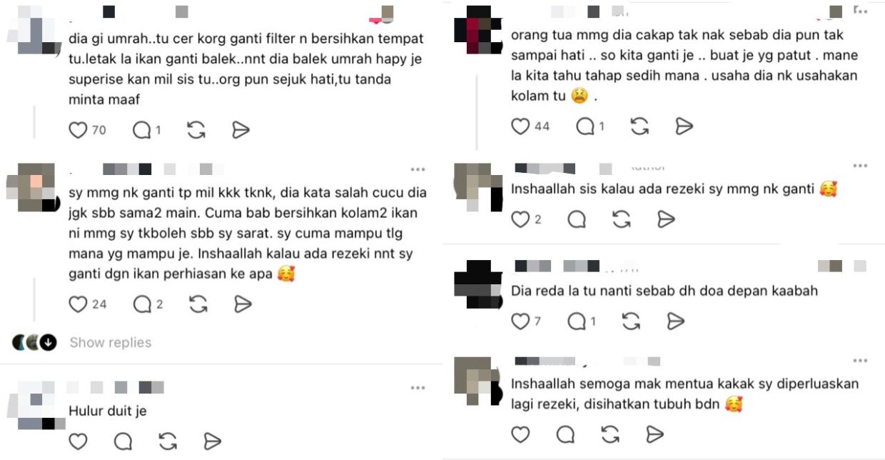 "Berpakat la bayar sikit. Jangan sekadar minta maaf je. Kasihan dia penat-penat ternak ikan. Ini cuma cadangan saya je," komen beberapa netizen.