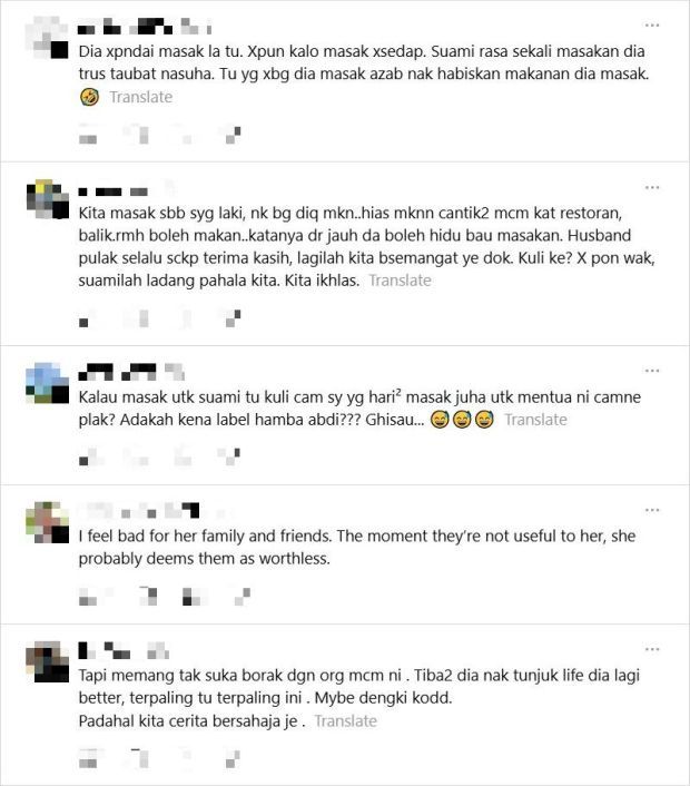 "Dia tak faham ke, antara suka masak dan kena paksa masak? Kadang orang macam ni dia jeles kot, sebab orang dok share pasal masak, tapi dia tak pandai masak."