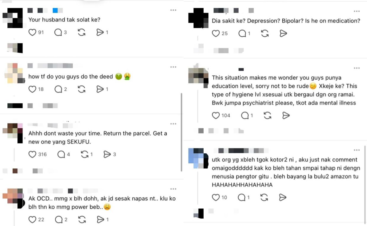 "Kak ni bukan hal remeh. Macam mana kau boleh hidup dengan suami pengotor macam ni? Asas kebersihan pun dia tak boleh jaga macam mana la nak jaga anak bini," komen netizen.
