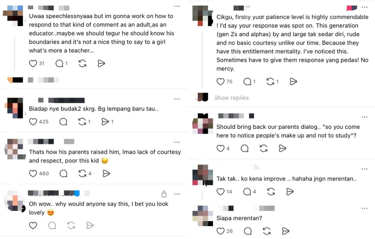 "Katanya tidak, cuma nampak 'fake' (palsu) macam pondan," guru itu menceritakan semula kejadian yang berlaku dalam kelasnya, menerusi laman Threads.