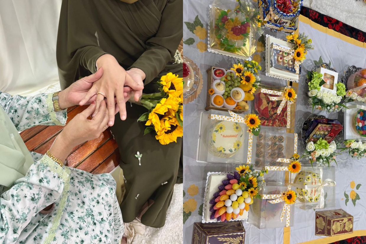 Jelasnya, segala persiapan majlis dibuat secara sederhana termasuklah baju pertunangan dan solekan malah hantaran turut digubah sendiri.