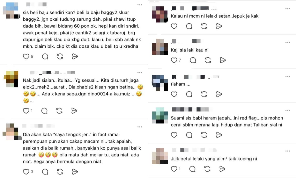 "Jangan biarkan dia. Kena mula jaga diri sendiri. Pakai cantik-cantik untuk diri sendiri. Kena mula membalas semula dah, tapi tetap dengan cara sopan," komen beberapa netizen.