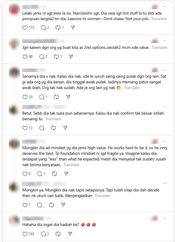 Netizen menyokong tindakan wanita itu dan mengecam sikap lelaki berkenaan yang dilabel sebagai narsis, perasan bagus, dan tidak matang dalam soal hubungan.
