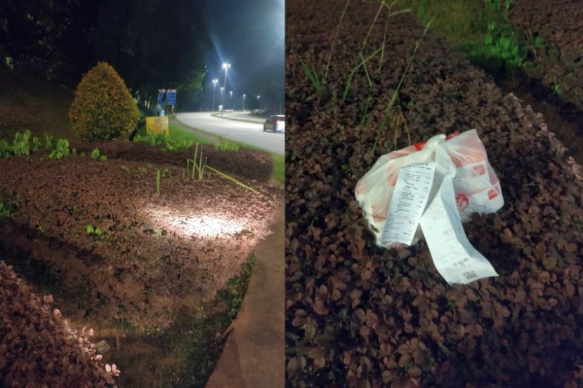 Berdasarkan gambar yang dikongsikan, bungkusan makanannya diletakkan di atas pokok hiasan di tepi jalan utama.
