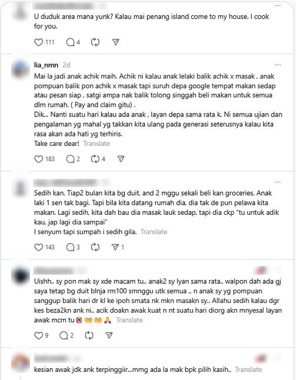 Dalam pada itu, beberapa netizen turut menzahirkan harapan agar lebih ramai ibu bapa masa kini sedar akan kesan jangka panjang layanan tidak seimbang terhadap emosi dan hubungan kekeluargaan.