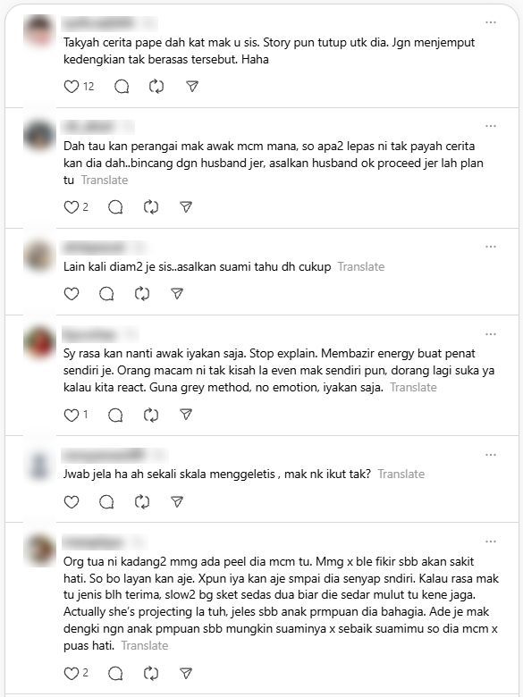 "Dah tahu kan perangai mak awak macam mana, jadi apa-apa lepas ni tak payah ceritakan dekat dia dah. Bincang dengan suami je," demikian antara komen netizen.