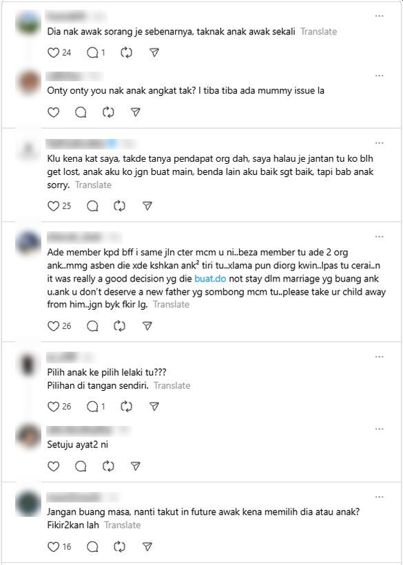 Selain meluahkan rasa simpati dan memahami situasi yang dihadapi oleh wanita tersebut, ada antara mereka yang menasihatkannya agar tidak mengabaikan perasaan anak dan menegaskan bahawa tiada kompromi apabila melibatkan emosi serta kebajikan zuriat sendiri.