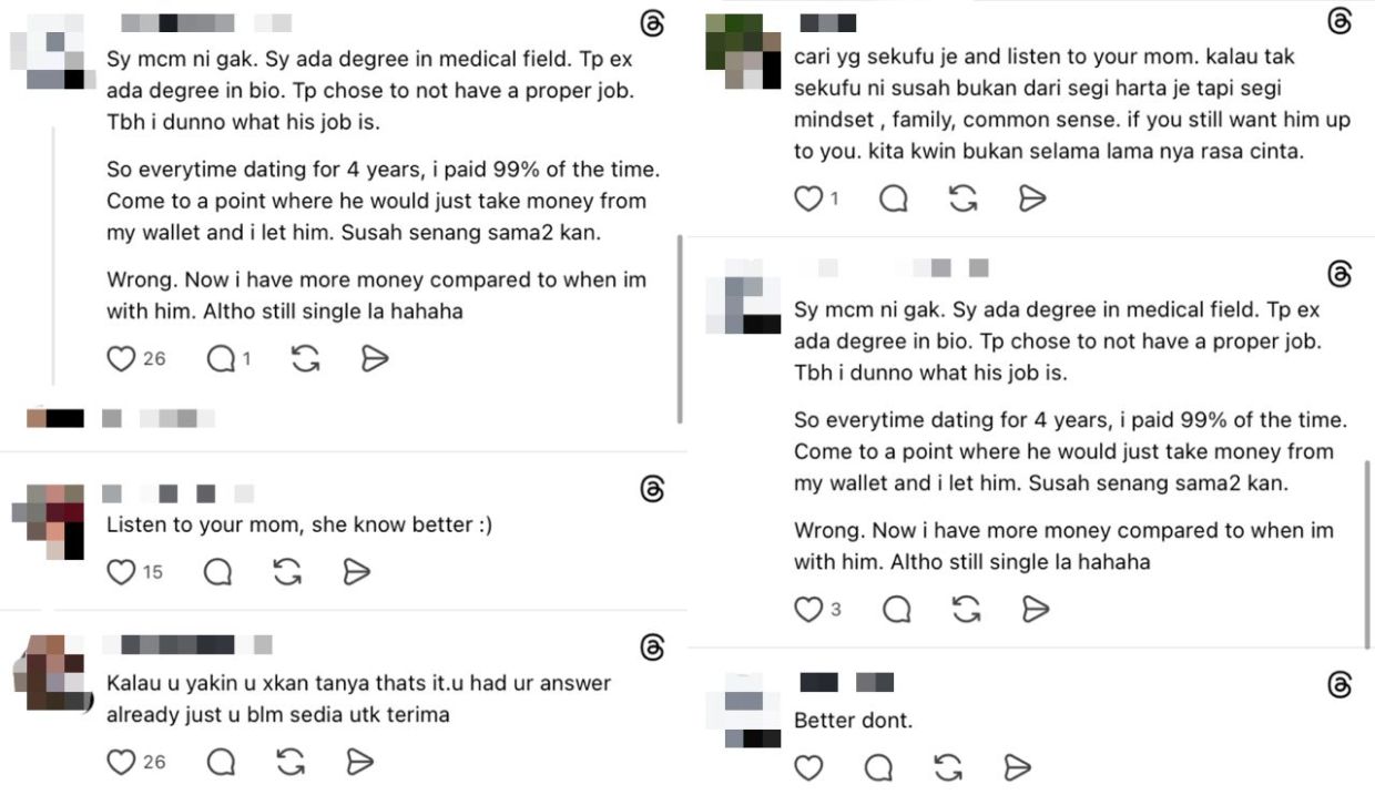 "Sekarang kekasih saya kerja kilang biasa je. Dekat media sosial ni ada tak orang pernah berada dalam situasi macam ni. Famili saya persoalkan kenapa tak cari yang berpendidikan juga," ujarnya.