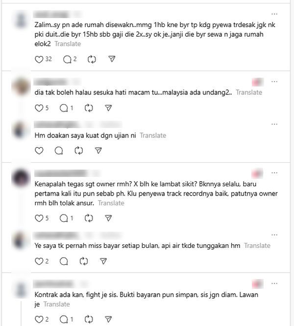 "Kalau penyewa ada track record baik, patutnya owner rumah boleh tolak ansur," demikian komen netizen lagi.