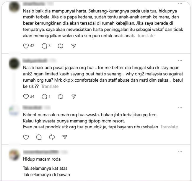 "Mujur ada pusat jagaan orang tua. Bagi saya lebih baik dia tinggal situ daripada stay dengan anak-anak tapi limited kasih sayang... buat hati tak senang," demikian antara komen netizen.