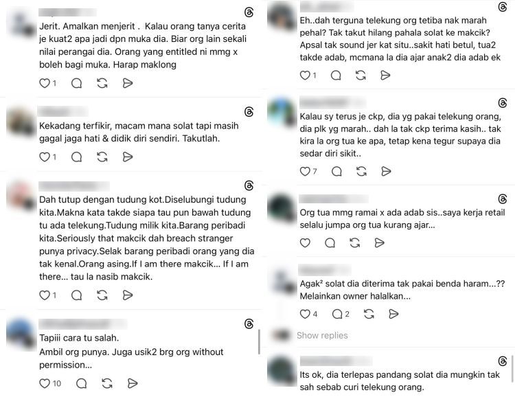 ADAB adalah cerminan akhlak seseorang, malah ia menggambarkan nilai yang dibawa dalam kehidupan seharian. Tidak kira tua atau muda, kita sewajarnya menjaga adab dan budi baik dari segi pertuturan dan tingkah laku. Namun, ada waktunya kita diuji dengan sikap manusia lain yang tidak mempunyai 'common sense', sebagaimana kisah yang dikongsikan oleh wanita ini mengenai pengalamannya bertemu seorang individu di sebuah Hentian Rehat & Rawat (R&R)."Singgah satu R&R ni, keadaan dalam surau tak ramai sangat yang solat. Jadi ada ruang dan tenanglah sikit. Kita dituntut untuk menjaga adab tanpa mengira usia atau pangkat. -Gambar hiasan"Aku keluarkan beg telekung dan letak atas beg, tutup dengan tudung. Aku pergi ambil wuduk. Lepas tu aku cari telekung aku... tak ada."Aku nampak ada seorang makcik ni pakai telekung aku yang dalam beg tu. Aku tunggulah dia siap solat," kongsinya di laman Threads.Menurut wanita tersebut, dia sama sekali tidak marah dan mengganggap individu sudah berusia itu tidak mengetahui telekung berkenaan adalah miliknya, bukan yang diwakafkan untuk surau tersebut.Namun dia tergamam apabila individu berkenaan memberikan reaksi yang tidak dijangka sebaik sahaja mengetahui telekung tersebut adalah miliknya.ARTIKEL BERKAITAN: Dah tumpang bermalam, pandai-pandai je kemas rumah orang! Wanita anggap tetamunya tiada adab, tak hormat ‘owner’ARTIKEL BERKAITAN: Tetamu kenduri geram sikap tak peduli mak ayah, biar anak makan bersepah dalam dewan kahwin - “Kau tinggal ‘tahi’ macam tu je!”"Aku cakap, maaf cik, ni telekung saya. Lepas tu dia buka dengan muka marah, letak atas lantai (sedangkan) aku hulur tangan nak ambil, dan tak cakap terima kasih pun. "Aku tak marah tapi lebih kepada perasaan sedih. Bila orang tua tak ada adab, macam mana anak muda nak beradab?" tulisnya lagi.Menariknya, selepas kisah itu dikongsikan, ramai yang turut tampil menceritakan pengalaman hampir sama.Seorang wanita kongsi pengalaman di surau R&R apabila telekung miliknya dipakai tanpa izin oleh seorang makcik.Dia tidak marah dan anggap makcik itu tidak tahu telekung tersebut bukan telekung wakaf.Namun, dia terkejut apabila makcik itu marah dan letak telekung di lantai tanpa ucap terima kasih.Wanita itu sedih kerana individu tersebut sebagai orang lebih tua tak tunjuk adab yang baik.Ramai netizen setuju dan berkongsi pengalaman sama, ada yang sarankan supaya orang sebegitu perlu ditegur.Ringkasan ini dijana oleh AI"Asbab Allah nak ajar saya tu. Tapi bila share, rupanya ramai juga yang ada pengalaman macam saya."Konsep mudah, pada pendapat saya, jika kita menghormati orang, insya-Allah orang pun akan menghormati kita. Lagi-lagi bila orang lebih berusia tunjukkan contoh yang baik, anak muda akan ikut," tulisnya lagi di bahagian komen.Di ruangan komen, rata-rata warga maya turut bersetuju dengan pendapat wanita tersebut, namun tidak kurang juga ada yang menyarankan agar dia 'mengajar' individu demikian agar memahami erti adab.Sebahagian daripada komen netizen."Kenapa tak sound aje... kalau aku, memang kena maki dengan aku. Tak kiralah dia siapa."Orang tua yang rasa entitled sebab dia rasa dia hidup lebih lama daripada orang muda."Kalau saya terus je cakap, sudahlah pakai telekung orang, dia pula yang marah. Tak cakap terima kasih pula tu. Tua tak tua, tetap kena tegur supaya sedar diri," demikian antara komen netizen.