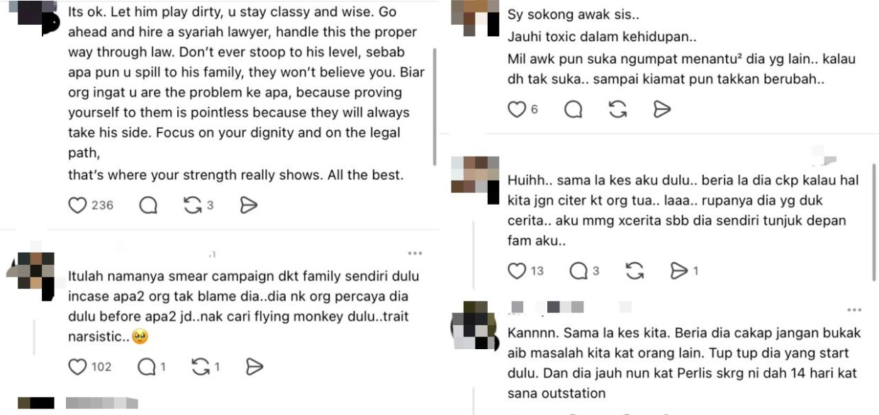 "Serius la, saya ingatkan saya (suami) je tak normal. Canang hal rumah tangga dekat mak saudara, adik beradik dan mak ayah dia. Rasa macam saya ni kahwin dengan 'wanita jadian'," komen beberapa netizen.