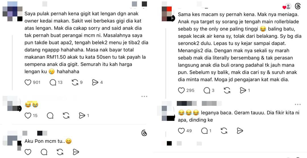 "Dia sengaja play victim (pura-pura jadi mangsa keadaan) dengan menangis kuat-kuat. Lepas tu mak dia datang tanya kenapa. Mak dia makcik kafe'(pekerja) tu," jelasnya.