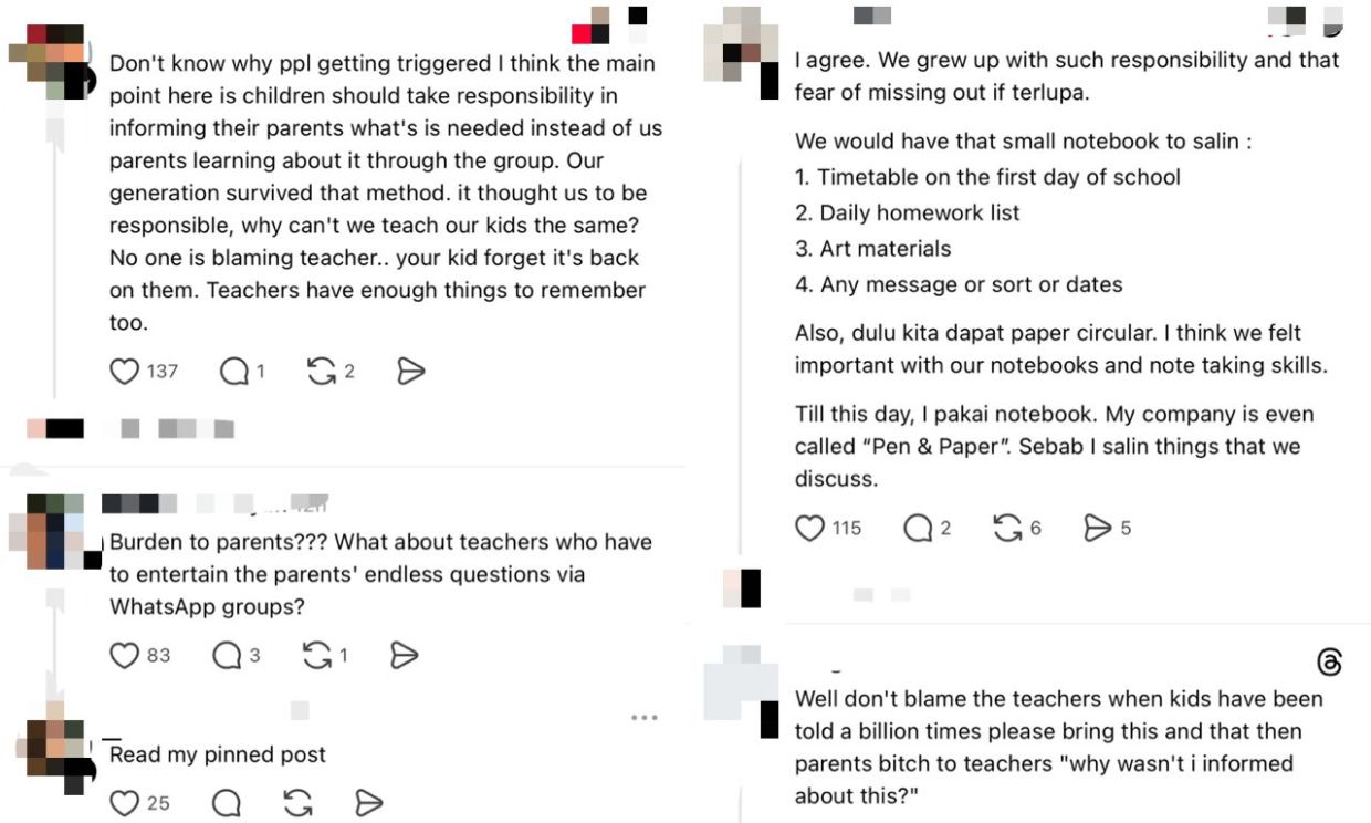 "Itu tanggungjawab ibu bapa untuk cakna tentang pelajaran termasuklah ambil tahu mengenai jadual sekolah anak. Awak boleh pilih untuk keluar daripada grup kalau rasa pelajaran anak tu satu beban," komen beberapa netizen.