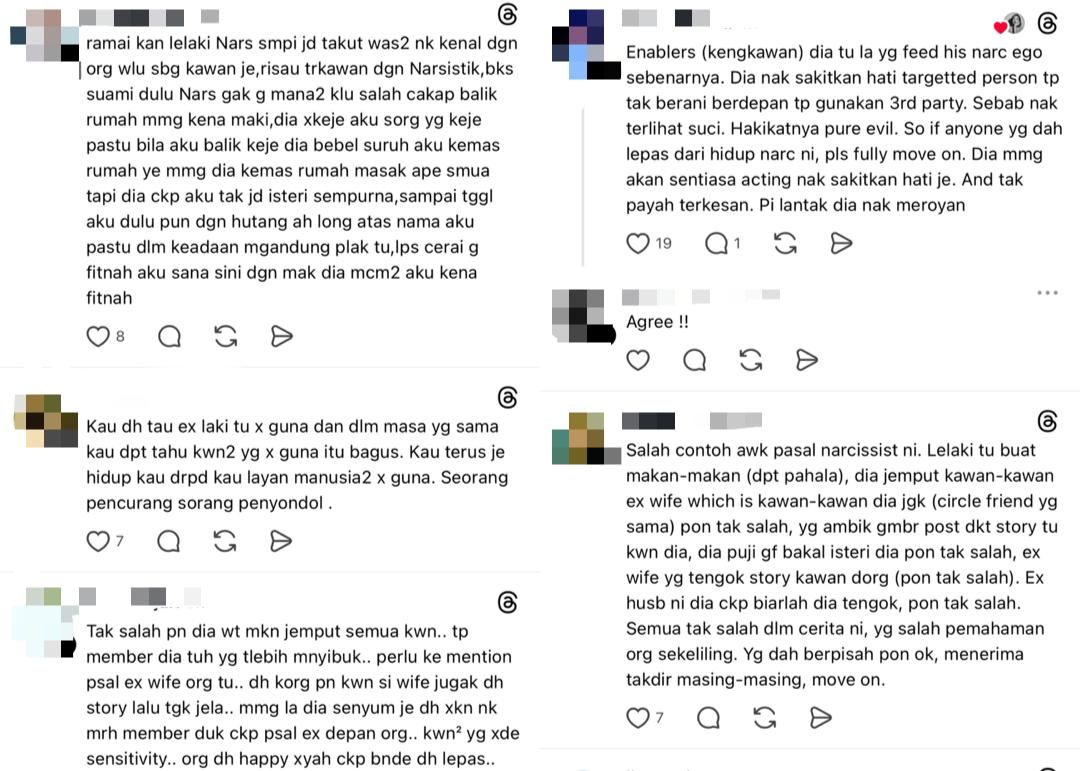 "Narsistik ni orangnya nampak baik je depan kawan-kawan dan orang luar. Tapi dengan keluarga dan pasangan sendiri macam syaitan. Saya tahu sebab boleh rasa.