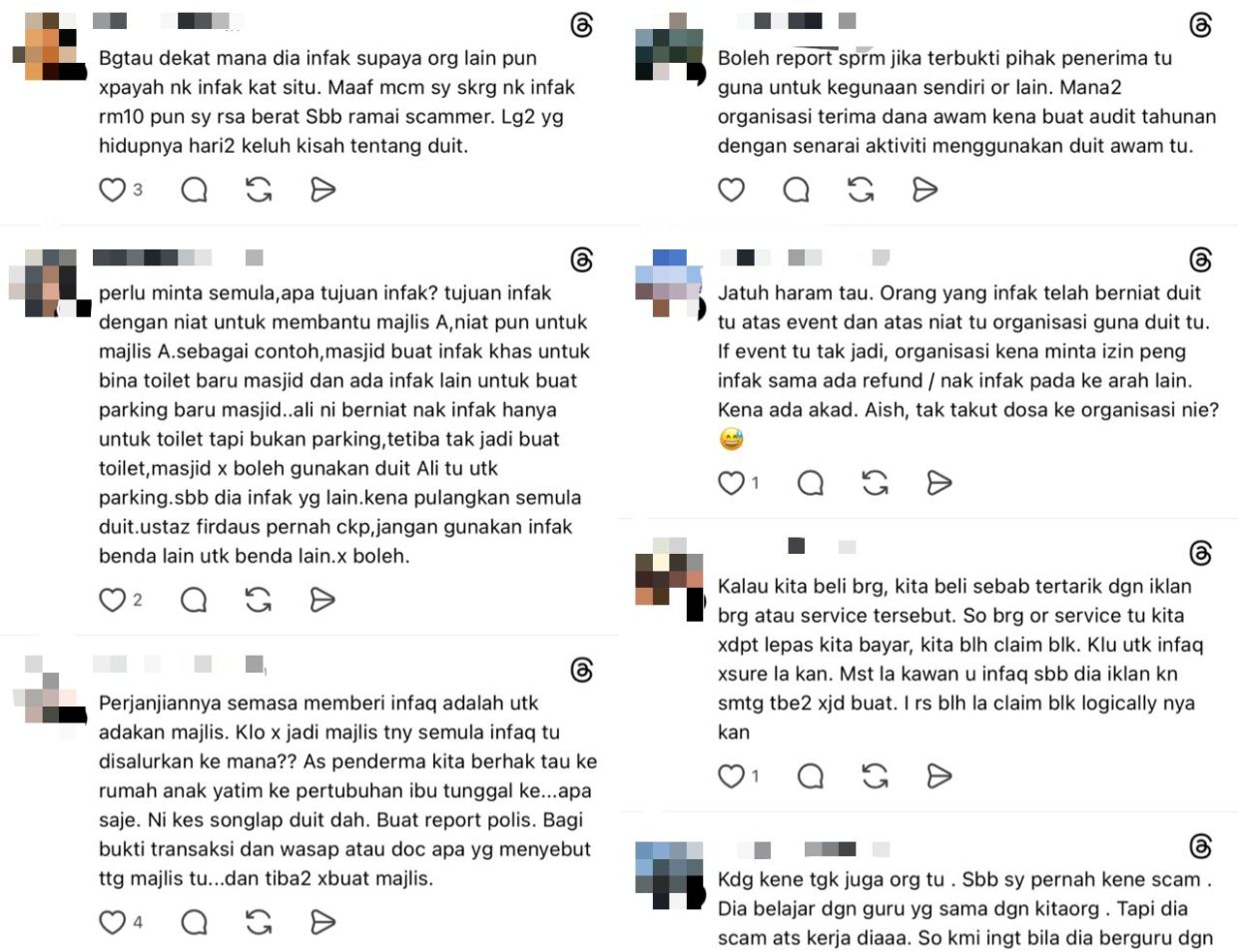 "Kawan saya tak puas hati, dia minta balik duit infak tu sebab tahu ada berlaku ketidakjujuran di situ," katanya di Threads.