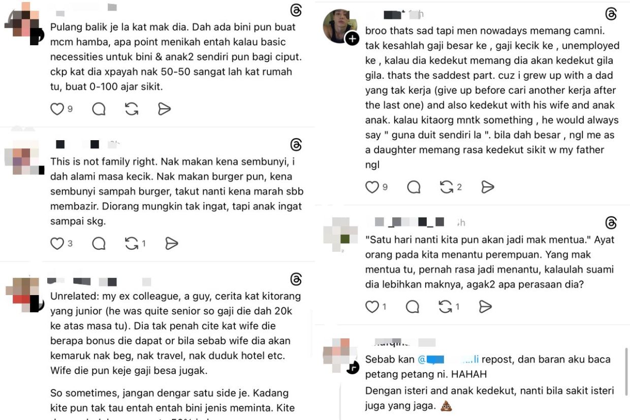 "Lelaki sekarang memang macam tu. Gaji besar tapi kedekut. Belanja dapur pun bagi cukup-cukup je takut bini makan sedap. Sebab itu la bini kena ada duit sendiri.