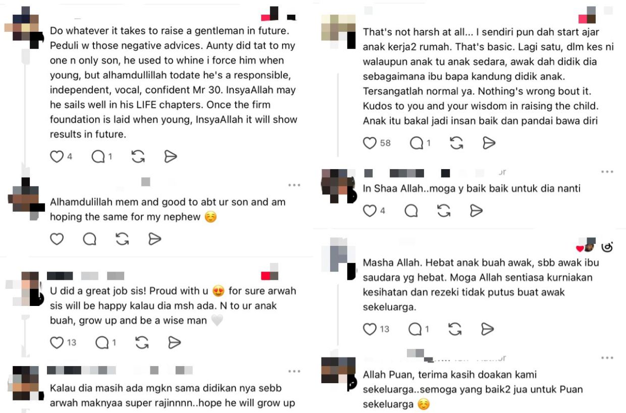 "Terima kasih bantu dia belajar jadi seorang lelaki. Bukan arwah kakak awak je gembira, anak saudara sendiri pun bersyukur nanti apabila dia diberi peluang belajar semua kemahiran ni," demikian komen netizen.