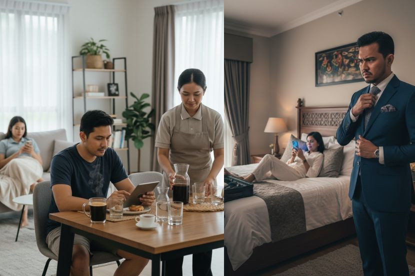 - Semua kerja rumah dibuat pembantu, isteri banyak main telefon.