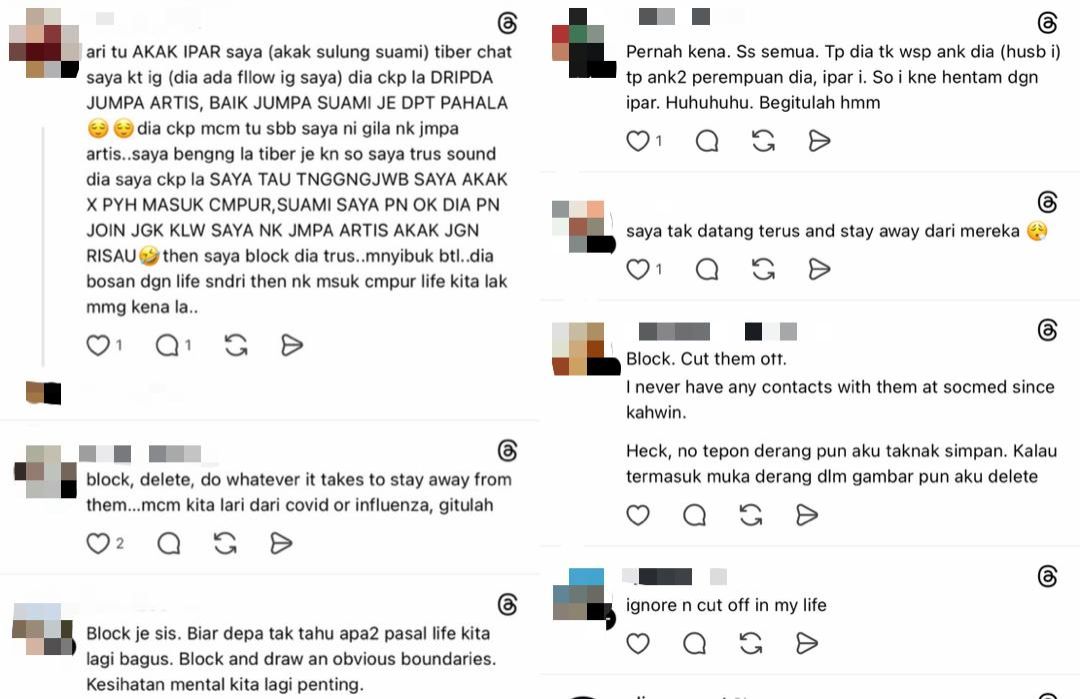 "Block (sekat) je sis. Biar mereka tak tahu apa-apa fasal kehidupan kita lagi bagus. Wujudkan batas yang tak boleh dicampuri keluarga. Kesihatan mental kita lagi penting," cadang beberapa netizen.