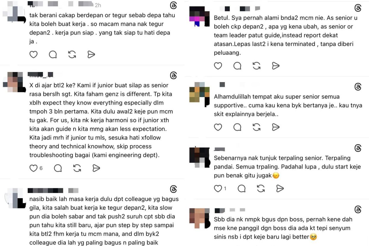 Berdasarkan perkongsiannya di laman Thread, dia berpandangan, tindakan segelintir senior yang gemar 'membawang' di belakang hanya membuatkan pekerja baharu sukar memberi tumpuan terhadap tugasan.