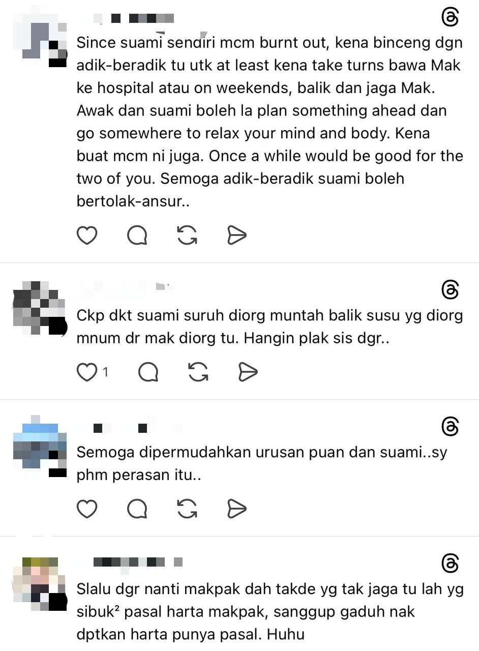 "Suami kata dia letih dan nak 'me time' juga. Bukan dia tak nak berbakti, cuma rasa burn out jaga mak dan bekerja. Dia sayang mak dia. Saya pun rasa sedih," jelasnya lagi.