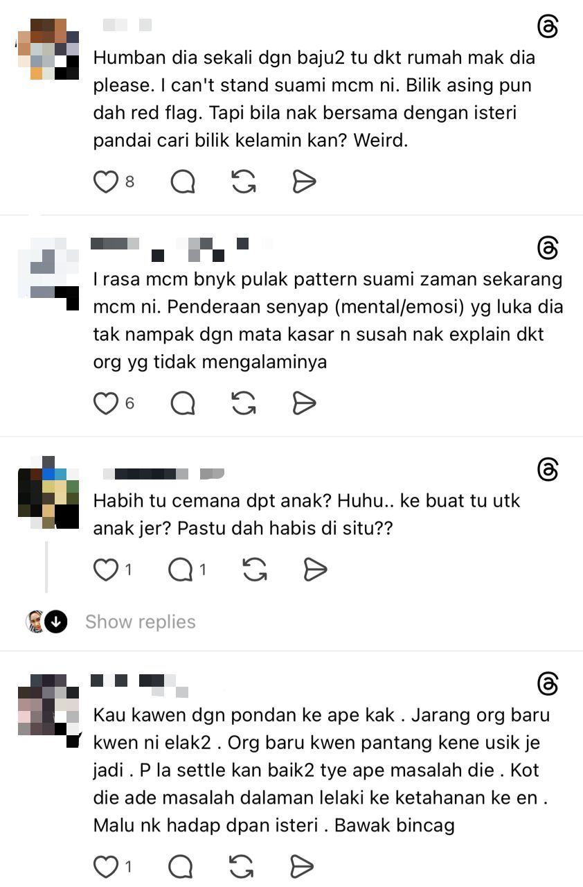 "Bilik kelamin? Tak ada istilah macam tu dalam rumah saya sebab suami ada bilik dia sendiri," ujarnya dalam hantaran di Threads.