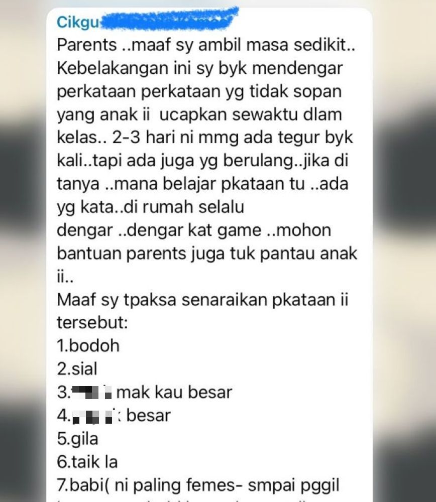"Parents, maaf saya ambil masa sedikit. Kebelakangan ini saya banyak mendengar perkataan yang tidak sopan diucapkan anak-anak sewaktu di dalam kelas.