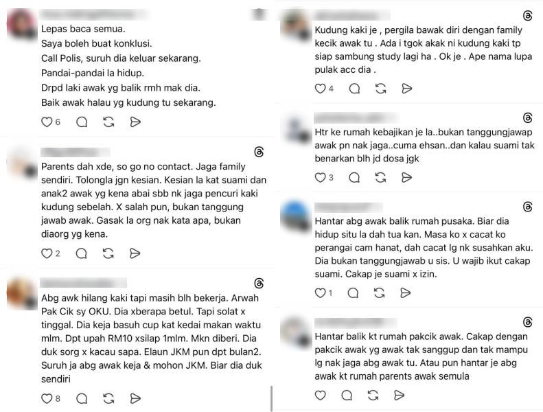 Di ruangan komen, rata-rata netizen bersimpati dengan nasib wanita berkenaan malah menyuarakan cadangan untuk mengatasi masalah yang dihadapinya.