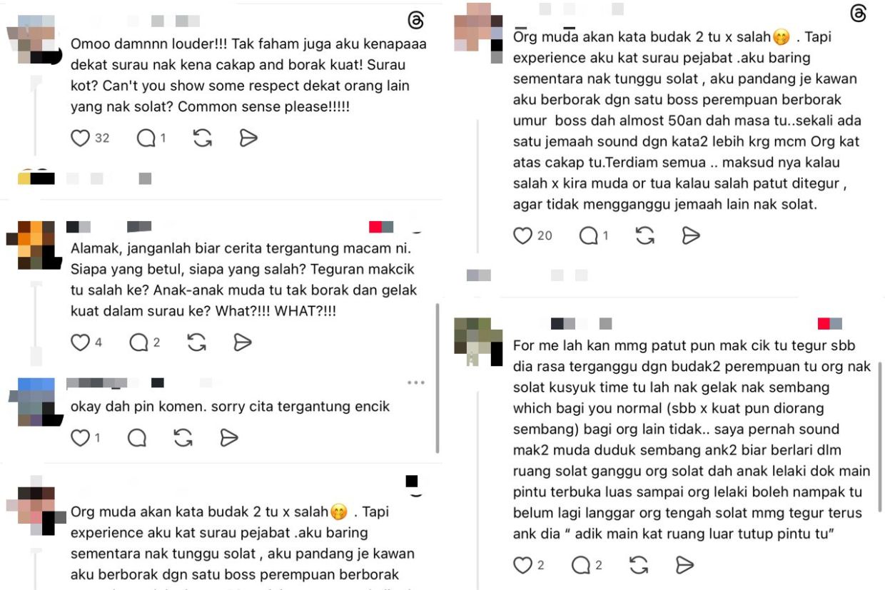 "Saya pun selalu tegur manusia dalam surau. Kalau nak bercakap atau bergosip tu pergi la tempat lain," komen sesetengah netizen.