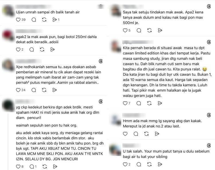 "Tak apalah, redakan saja semua tu. Didoakan asbab pemberian air tu awak akan dapat rezeki melimpah ruah ibarat air Zamzam," demikian antara komen netizen.